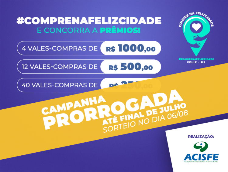 A Campanha Compre na FelizCidade, vai ter seu prazo ampliado até dia 31 de julho de 2020.